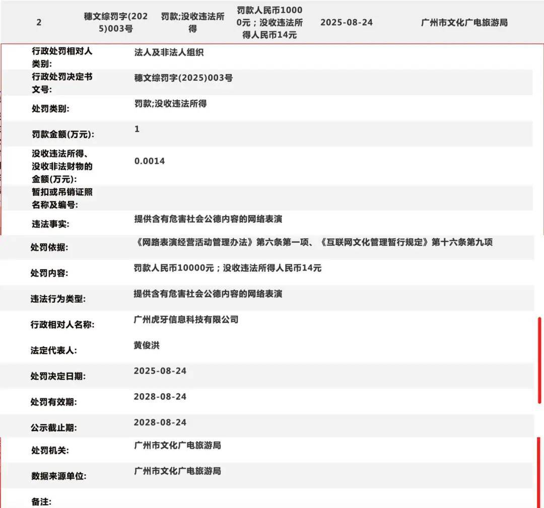 今年8月,虎牙直播因提供含有危害社会公德内容的网络表演,被广州市文化广电旅游局罚款人民币10000元,并没收违法所得人民币14元。