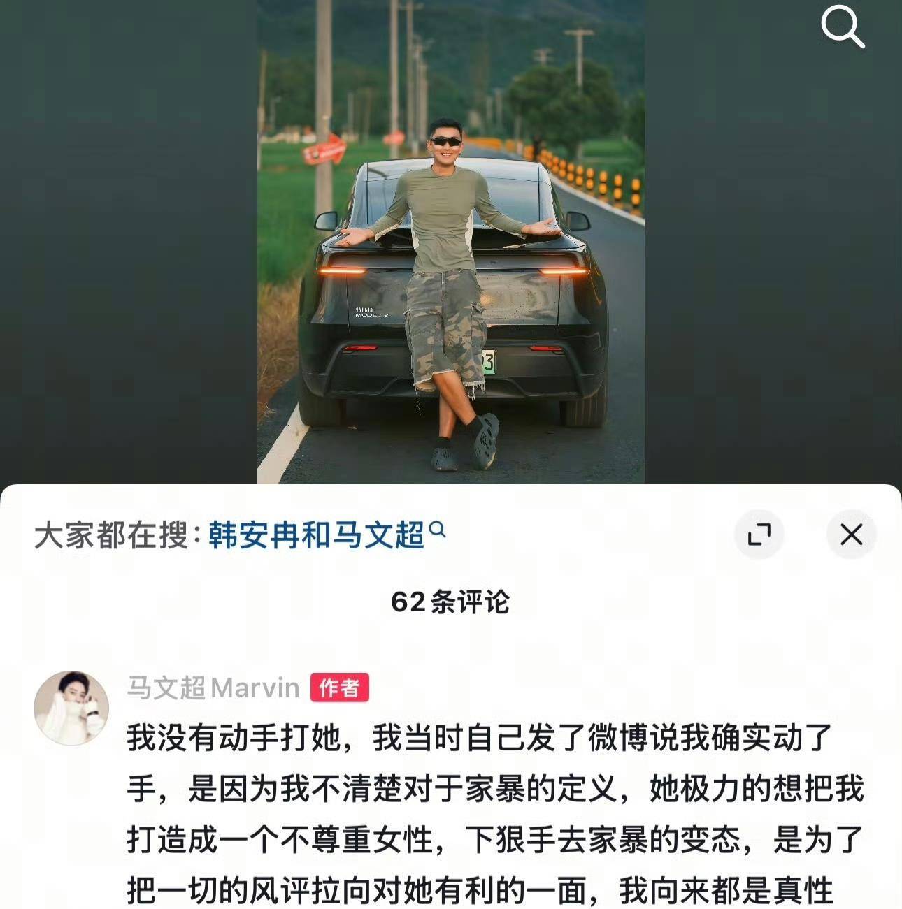 马文超承认双方有过肢体冲突,但强调不构成法律意义上的家暴,并称争执中韩安冉辱骂双方家人并抓伤其面部,他情绪失控将其推倒床上后立即道歉。