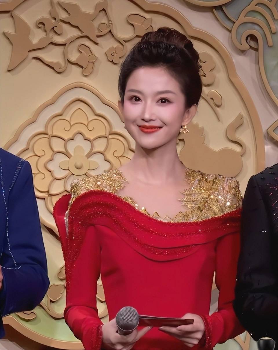 红裙映人,披发缓缓,站在那里就是一幅可远观的年画。也难怪有人说,她是90后里最能打的央视面孔。