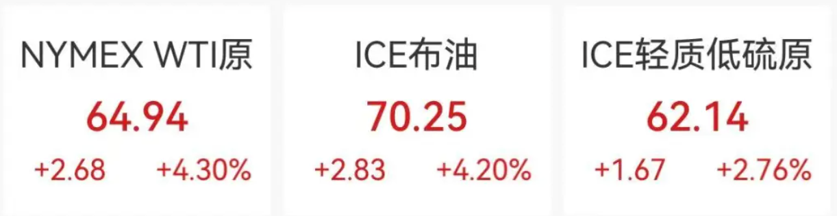 国际原油期货结算价大幅收涨超4%。WTI原油期货收涨4.3%,报64.94美元/桶;布伦特原油期货收涨4.2%,报70.25美元/桶。