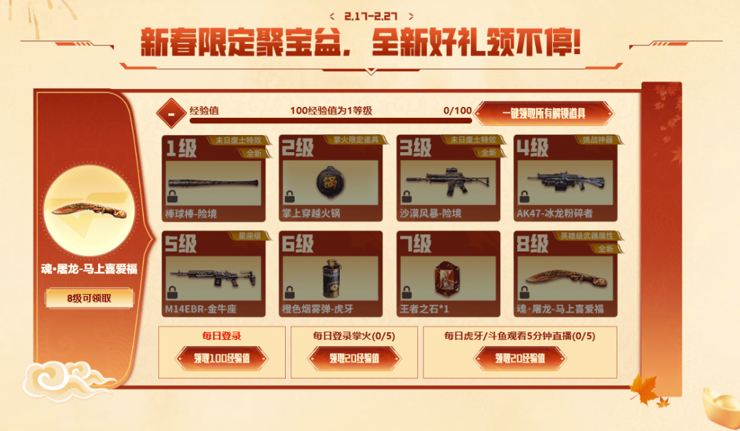 核心道具奖励:猫猫手套、M37-恶棍、幸运牛仔玩偶、疾爆手雷-河马、烟雾弹-神秘按键、Scar-Light-赤血龙魂等