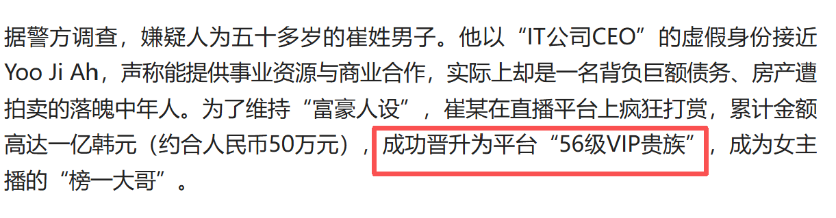 据警方调查,男子平时自称是IT公司老板,在直播平台花了超过一亿韩元打赏(约合人民币50万元),在平台等级中属于56级最高“贵族”。主播对他客气,观众都知道他有钱,他也习惯在评论区被称社”。